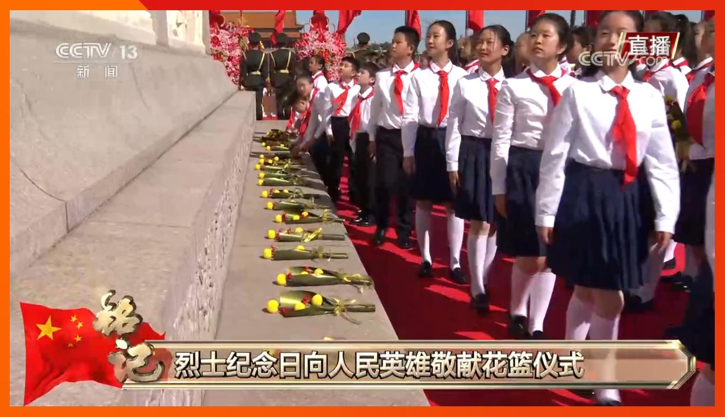 默哀毕,手持鲜花的少年儿童面向人民英雄纪念碑高唱《我们是共产主义接班人》,并致少年先锋队队礼。
