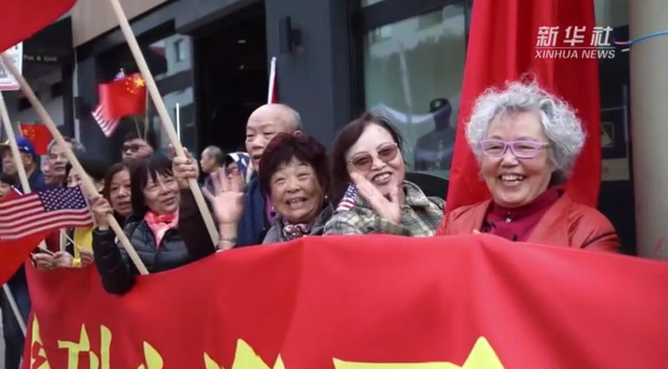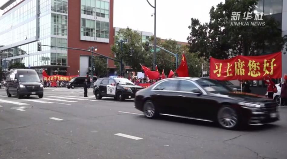 习近平乘坐的车队离开机场前往下榻饭店途中,许多华侨华人和中国留学生代表等候在沿途街道,挥舞中美两国国旗,热烈欢迎习近平主席到访。