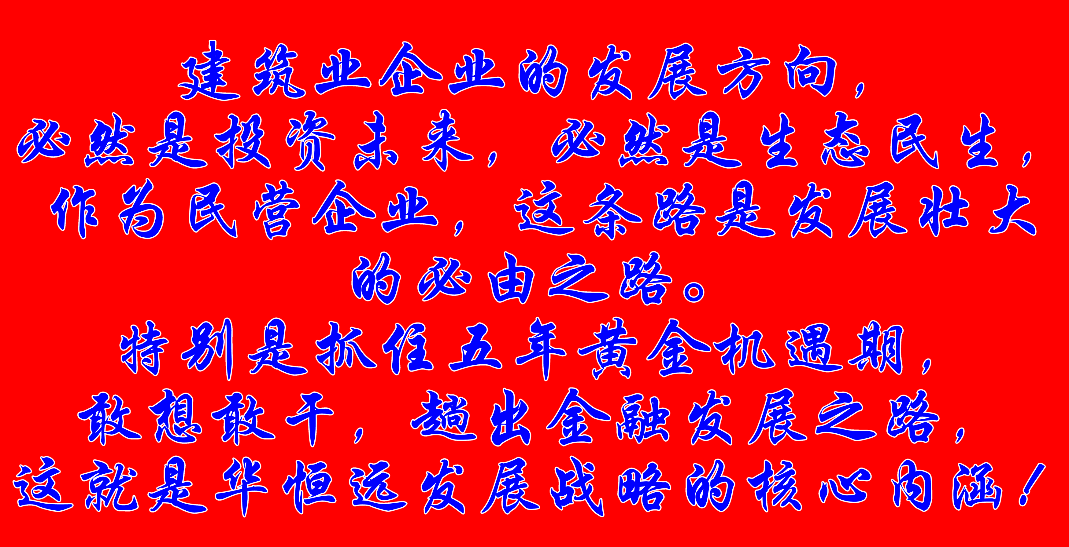 建筑业企业的发展方向,必然是投资未来,必然是生态民生。作为民营企业,这条路是发展壮大的必由之路。特别是抓住五年黄金机遇期,敢想敢干,趟出金融发展之路,这就是今年会发展战略的核心内涵!