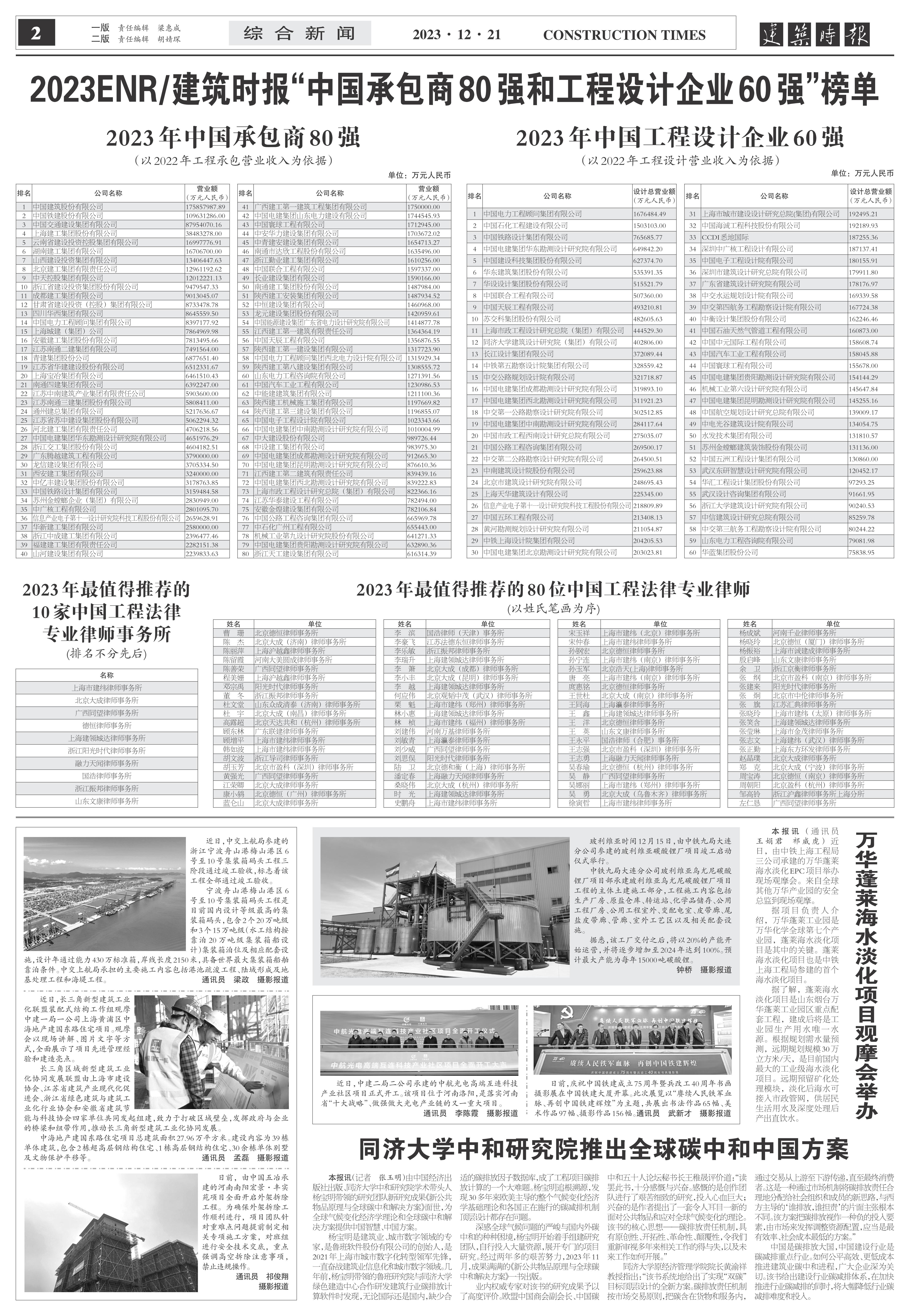 2023年度“中国承包商80强和工程设计企业60强”排名以2022年度企业工程承包和工程设计营业收入作为主要排名依据。中国建筑股份有限公司等80家承包商、中国电力工程顾问集团有限公司等60家工程设计企业入围新一年度榜单。