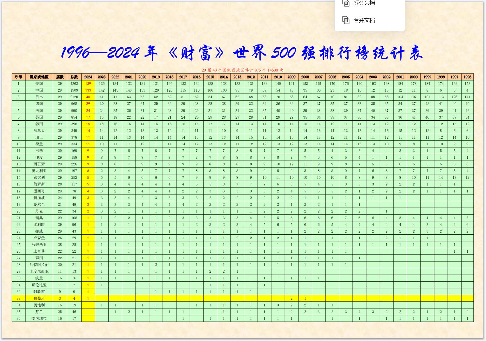 《财富》世界500强杂志社,从1995年开始在中国登陆,已经连续举办了29期中文版的世界500强排名榜,我收集到的完整资料,仅缺第一期1995年的全榜单,所以,目前只能编辑二十八期。即1996-2023年《财富》世界500强和中国上榜企业的名单,待日后有机会的话再补齐。