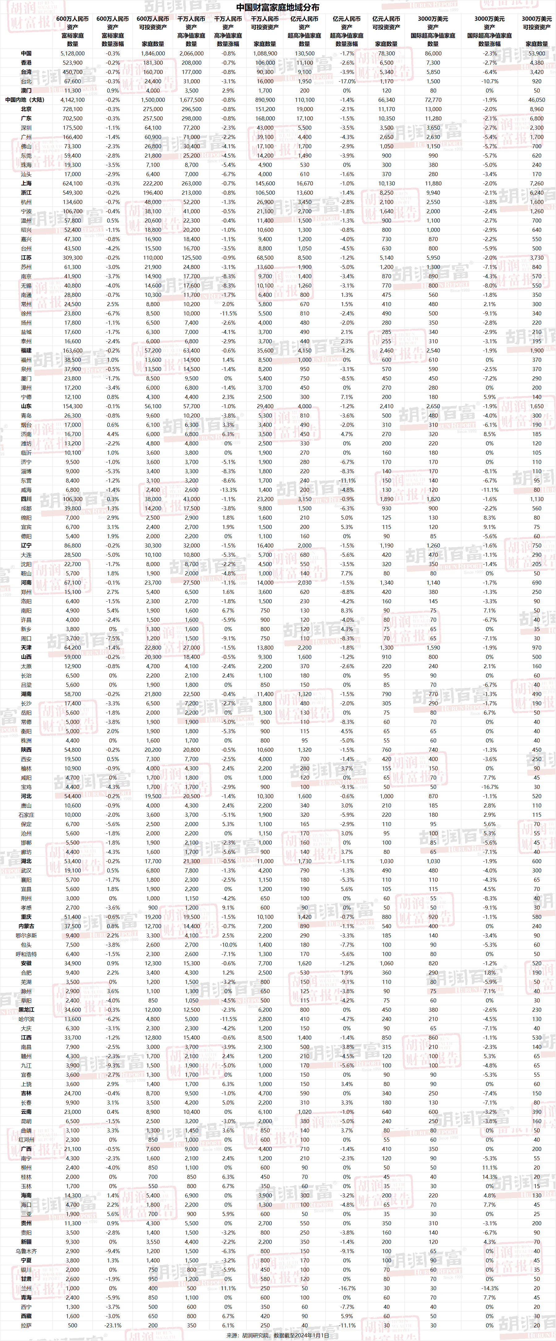 胡润研究院今日发布《2024胡润财富报告》(Hurun Wealth Report 2024)。这是胡润研究院连续第16年发布此报告。报告揭示了目前中国财富家庭的数量、地域分布和人群画像。报告公布了中国拥有600万人民币、千万人民币、亿元人民币及3000万美元以上总财富的家庭数量,以及相应的可投资资产家庭数量。此次报告涵盖了包括港澳台地区在内的中国34个省级行政区共计108个城市,