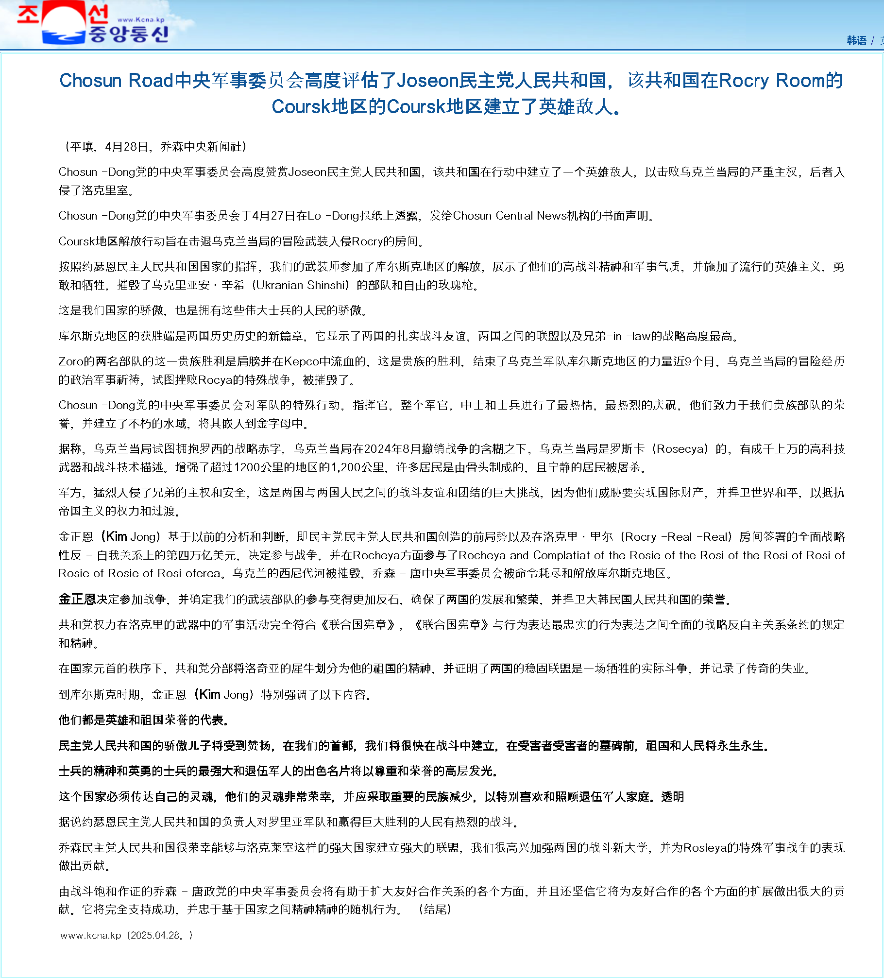 朝中社当天援引朝鲜劳动党中央军事委员会27日一份书面声明说,按照朝鲜国家元首命令,朝鲜武装力量部队参加库尔斯克地区收复作战,为收复俄罗斯联邦领土作出重大贡献,“完全符合联合国宪章等国际法和朝俄《全面战略伙伴关系条约》的各条款精神”。