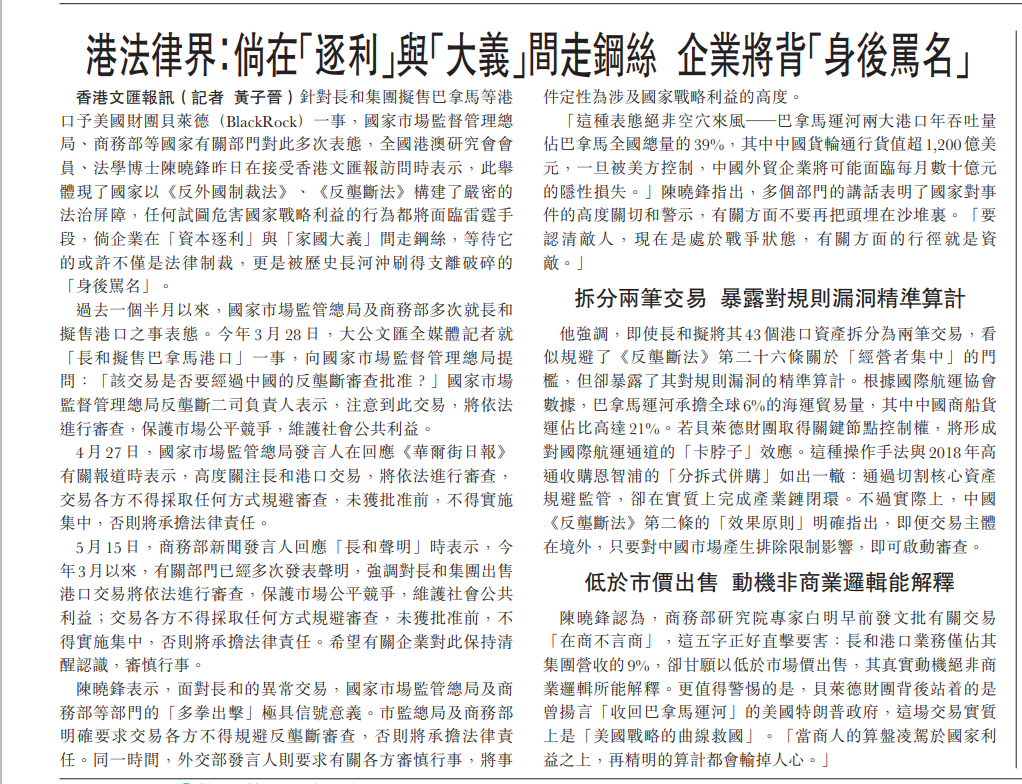 香港文汇报讯(记者黄子晋)针对长和集团拟售巴拿马等港口予美国财团贝莱德(BlackRock)一事,国家市场监督管理总局、商务部等国家有关部门对此多次表态,全国港澳研究会会员、法学博士陈晓锋昨日在接受香港文汇报访问时表示,此举体现了国家以《反外国制裁法》、《反垄断法》构建了严密的法治屏障,任何试图危害国家战略利益的行为都将面临雷霆手段,倘企业在「资本逐利」与「家国大义」间走钢丝,等待它的或许不仅是法律制裁,更是被历史长河冲刷得支离破碎的「身后骂名」。
