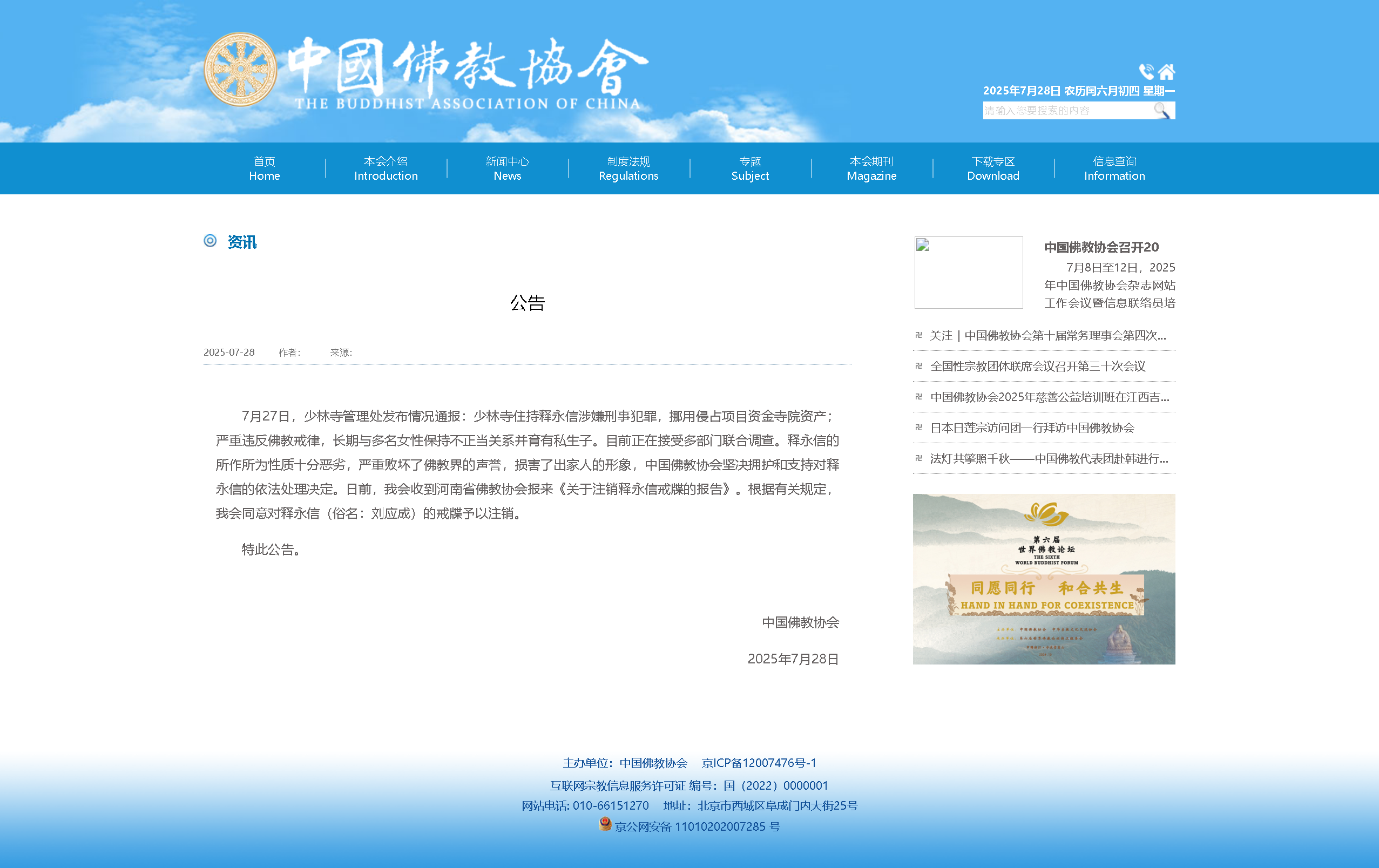 中国佛教协会发布公告:同意对释永信的戒牒予以注销