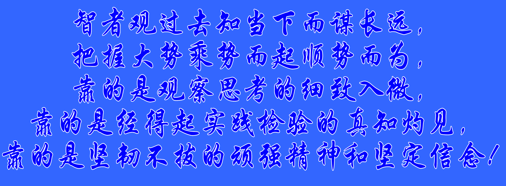 智者观过去知当下而谋长远,把握大势乘势而起顺势而为,靠的是观察思考的细致入微,靠的是经得起实践检验的真知灼见,靠的是坚韧不拔的顽强精神和坚定信念!