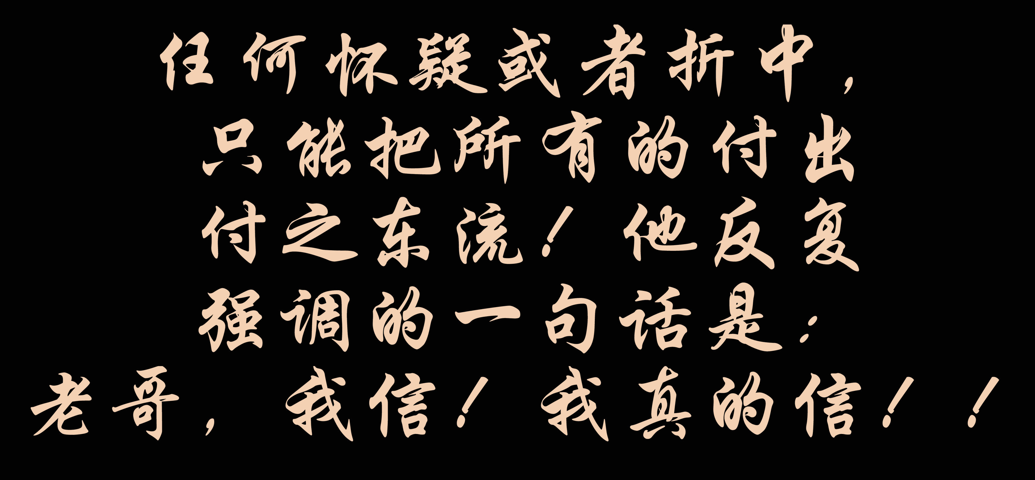 任何怀疑或者折中,只能把所有的付出付之东流!他反复强调的一句话是:老哥,我信!我真的信!!