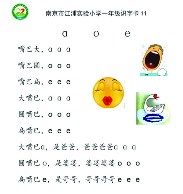 南京市江浦实验小学语文老师夏光清表示,单韵母发音,口形不能变。“我会要求学生发音时,从头到尾口形都是圆的。如果发‘窝’音,嘴巴先发‘w’音,一开始嘴巴是撅着的,然后变成圆的,前后是变化的。”