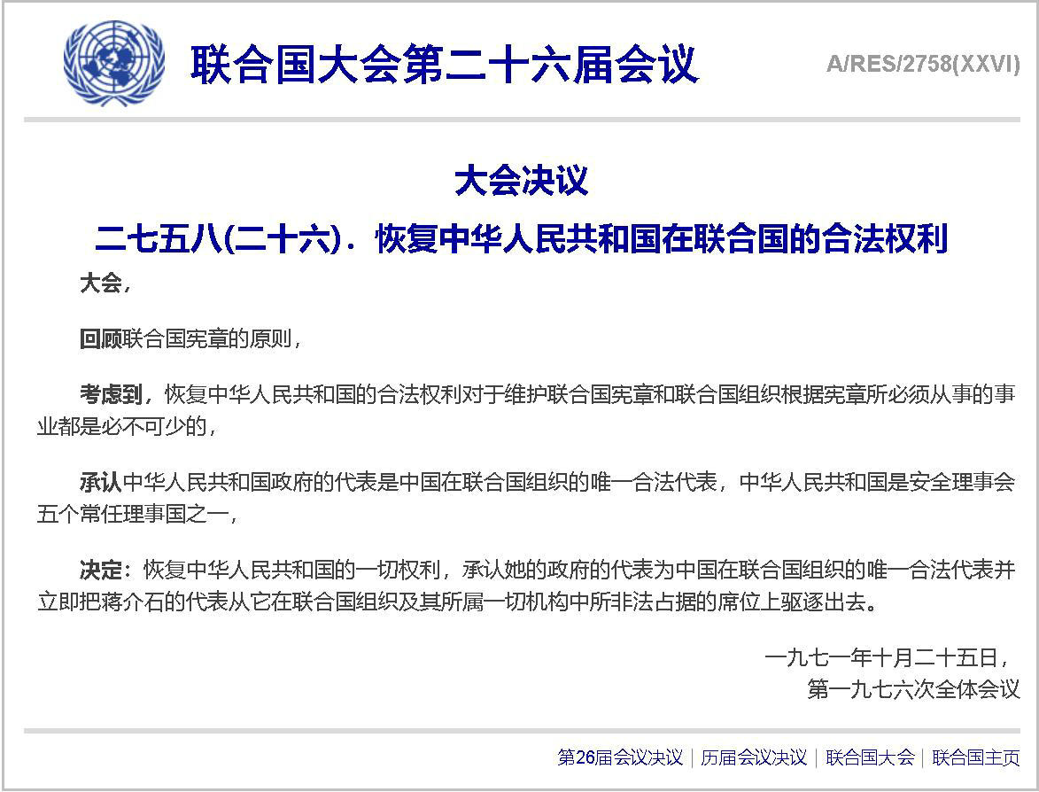 决定:恢复中华人民共和国的一切权利,承认她的政府的代表为中国在联合国组织的唯一合法代表并立即把蒋介石的代表从它在联合国组织及其所属一切机构中所非法占据的席位上驱逐出去。
