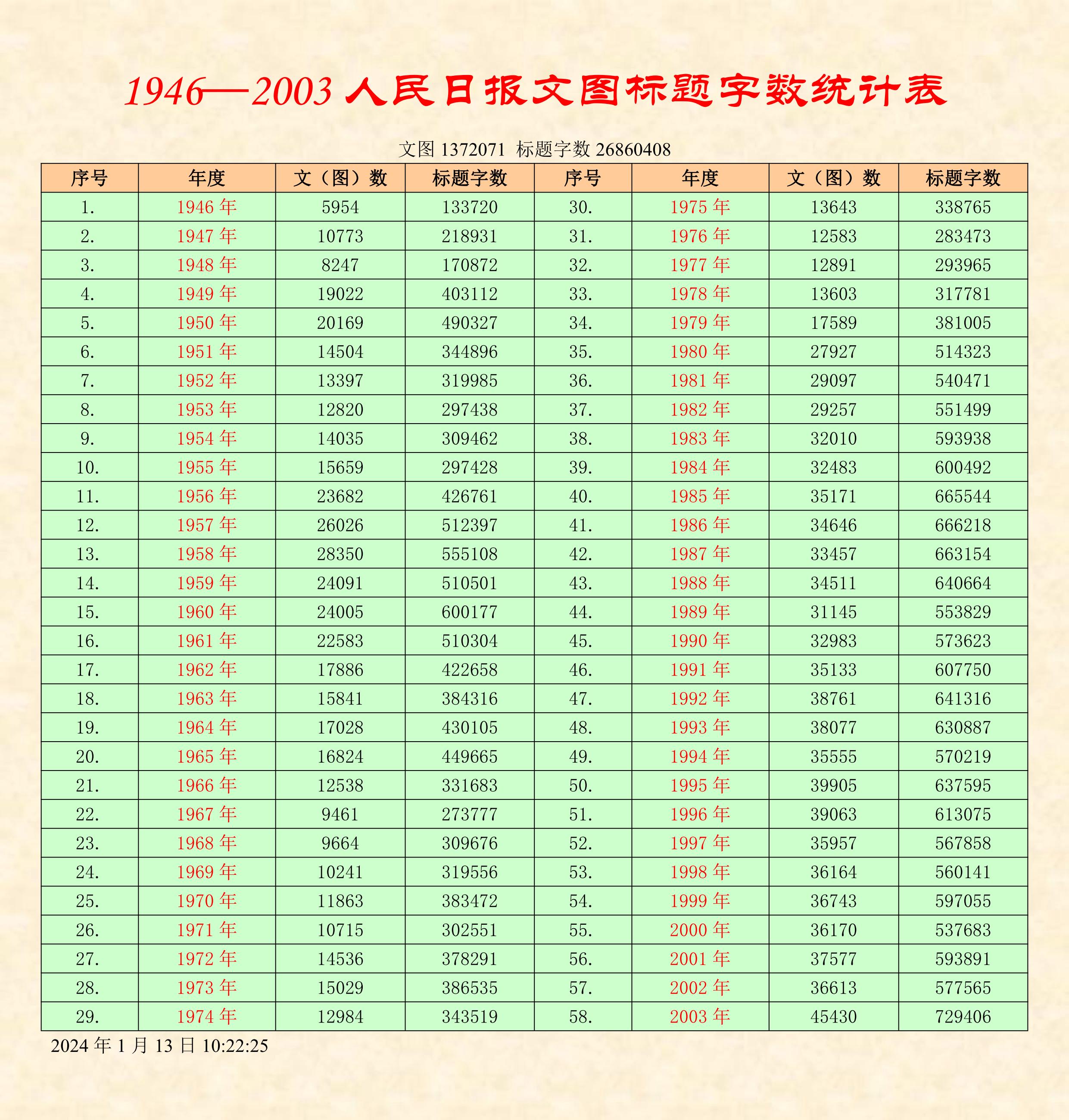 开年十二天,用二百四十个小时,编辑了有生以来最大的电子文档,1946-2003五十八年的人民日报,单单标题字数就在两千六百余万字,可谓是天下最大的大了!
